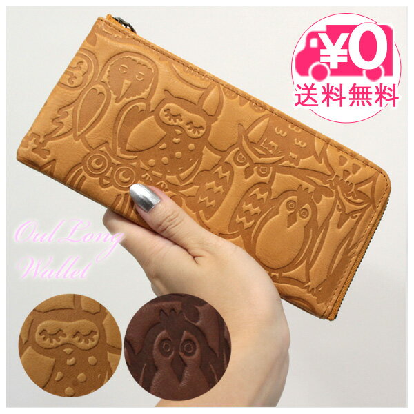 【送料無料】 ふくろう柄型押し L字ファスナー長財布 ダークブラウン イエロー レディース スリム 薄型 軽量 財布 本革 日本製